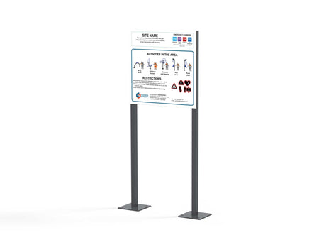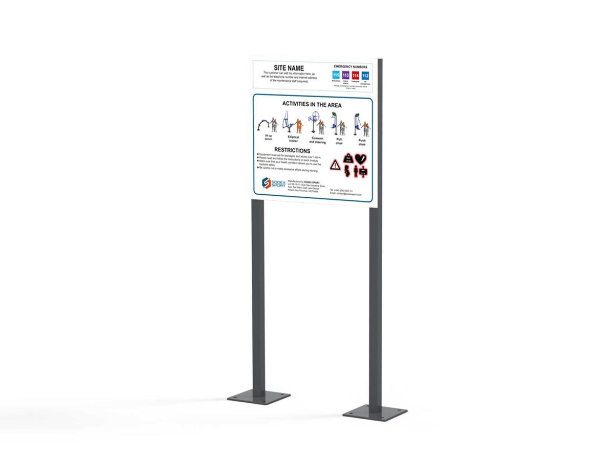 Information panel on posts measuring 1.8 m high and 0.75 m wide, mounted on two galvanized steel square posts (50×50 mm). Its gray color and robust build (27 kg) make it a durable choice for displaying information indoors or outdoors. Easy to install, suitable for various uses with accessories.