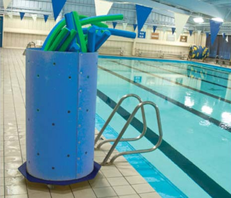 The vertical rack for pool noodles can hold approximately 30 noodles in an upright position. It features a base made of high-density plastic, non-marking swivel wheels, and stainless steel hardware.