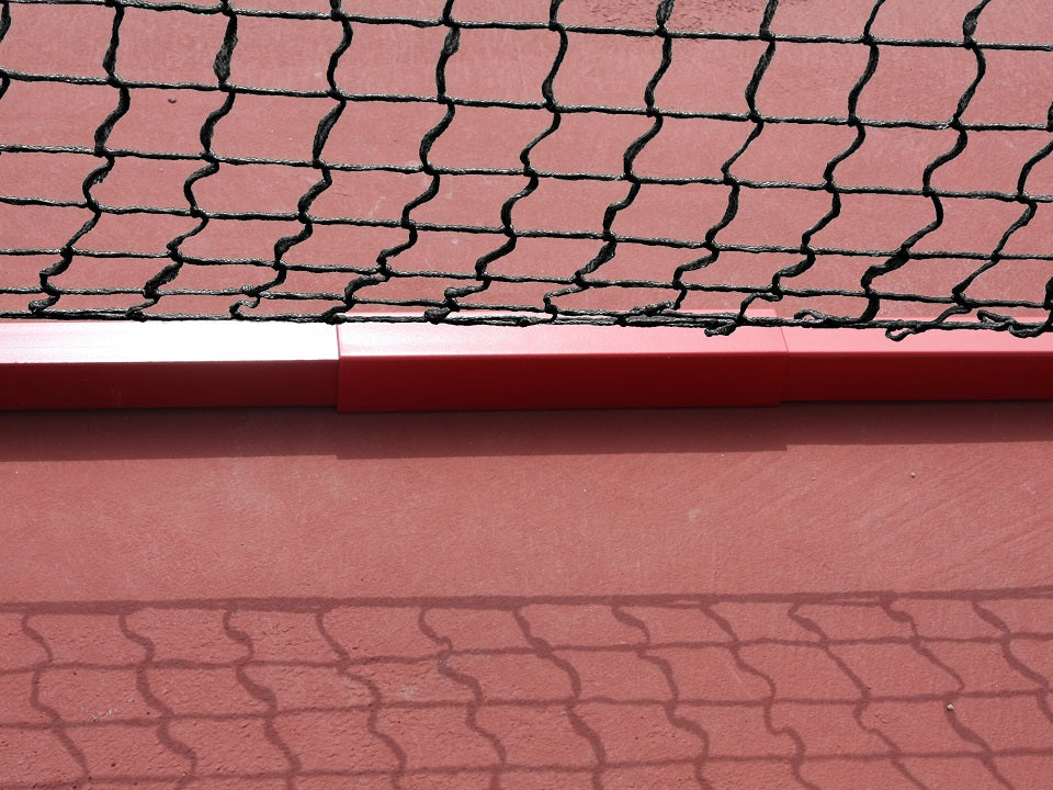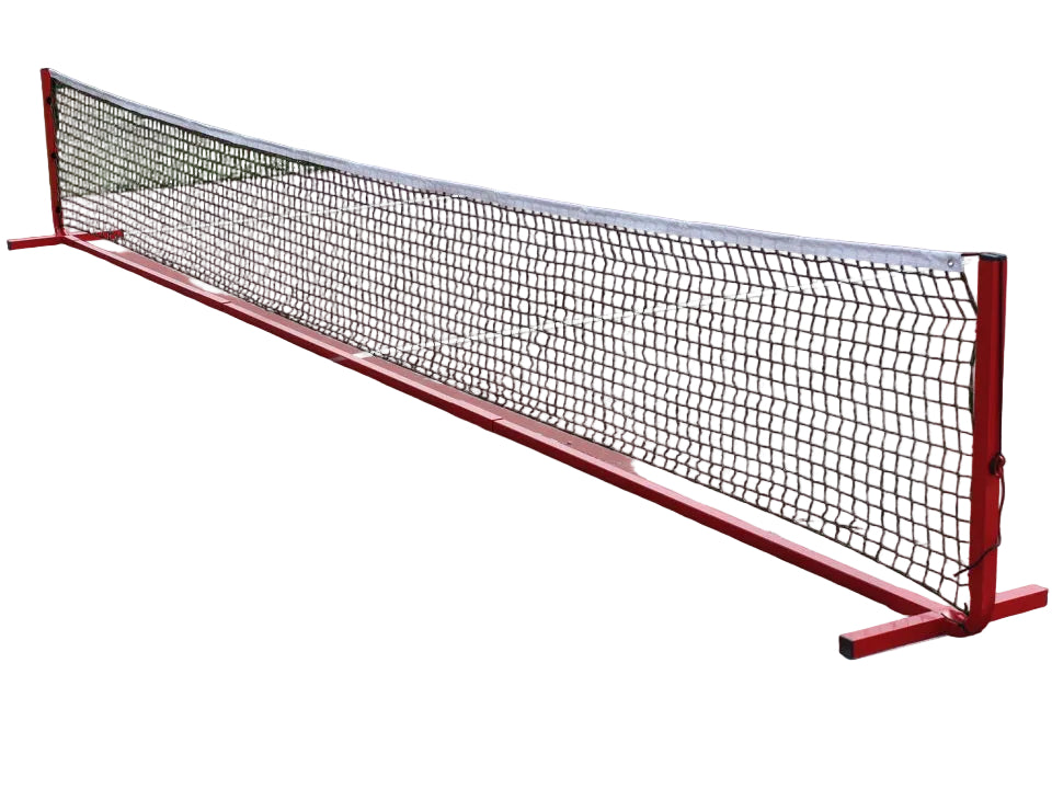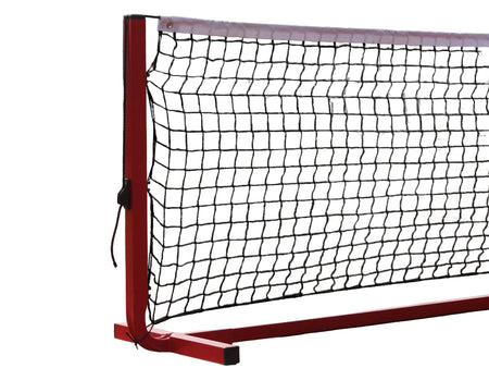 The Portable Mini Tennis Set is designed for quick, tool-free setup on any surface, ideal for school activities, training sessions, or introducing young players to tennis. It features red powder-coated aluminum posts with a square profile of 40 x 40 mm, a lower steel bar for stability, and a 3 mm knotless woven polypropylene net. The set measures 8 meters long and 0.8 meters high, with a net height of 0.76 meters. Lightweight and easy to transport, it assembles easily with sturdy steel connectors and allows quick net tensioning via a toggle clamp.