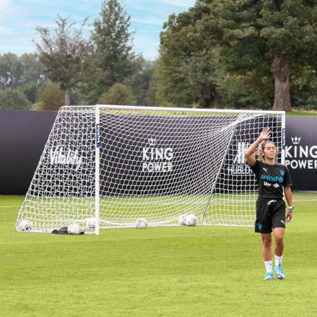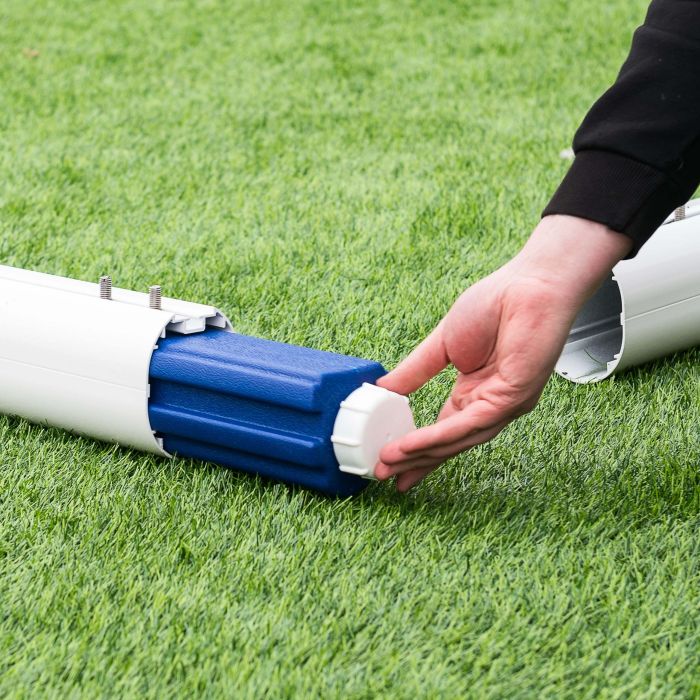 Goal frame: Reinforced 60 mm or 110 mm diameter aluminum (2.5 mm thickness) – durable and lightweight. The rust-resistant frame is coated with optical white polyester powder coating. The premium powder coating provides complete scratch resistance. Folding side panels and back frame: 30 mm diameter galvanized steel. Removable back bars are equipped with quick-release pins (manual operation – no tools required). The goal frame features fully welded corner joints for added strength and longevity.