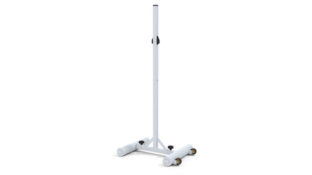 Central mobile training badminton posts, in square steel 40 x 40 mm with fixed upright at 1.55 m in height, double-sided counterweight 20 kg, white powder coating, use with manual tensioning of the net by jammer.