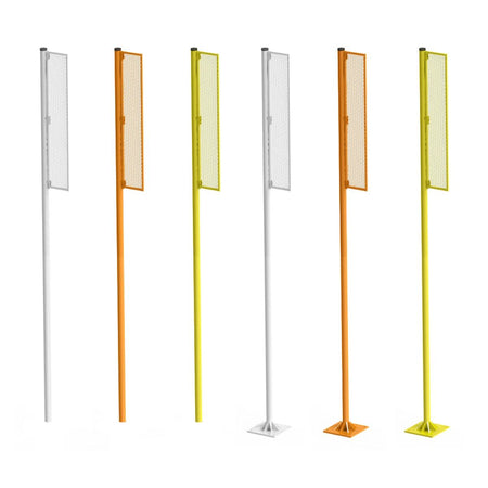 Choice of 3 colors yellow, white or orange. posts serve as an extension to the foul line of baseball or softball fields. Choice of ground or surface mounting.