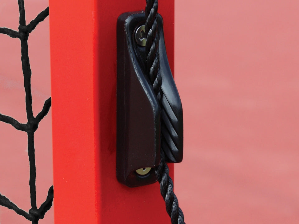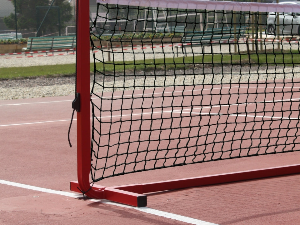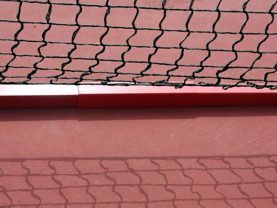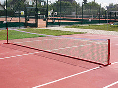 Mini tennis posts above ground, 3, 4 or 6 m long, red powder coated, aluminum uprights, steel floor bars. Comes with net. Posts of 40 mm x 40 mm, height 0.80 m with manual tensioning of the net. Intermediate bars and joints in steel tube. easy to assemble. Easy tightening of the net