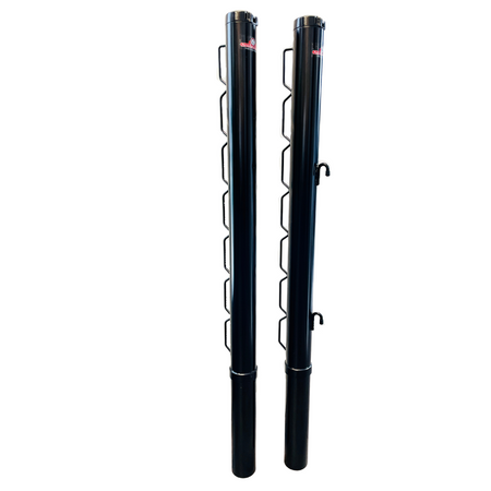 External winch pickleball posts. Made of 2-7/8" galvanized steel, these posts are 36" tall and include post caps and an aluminum exterior crank. Black color.