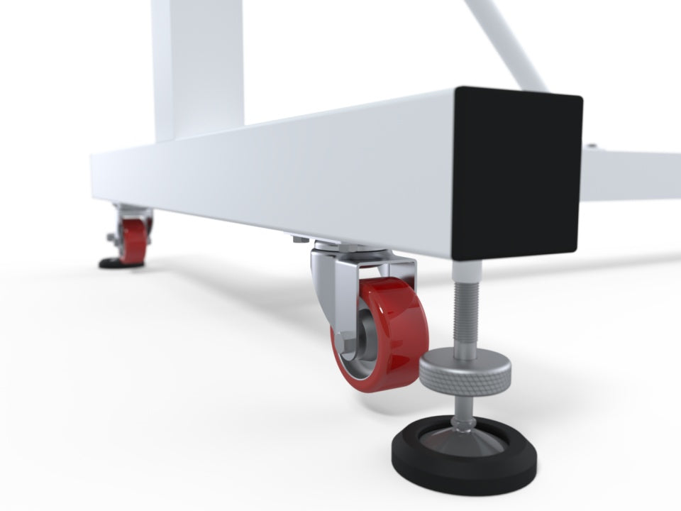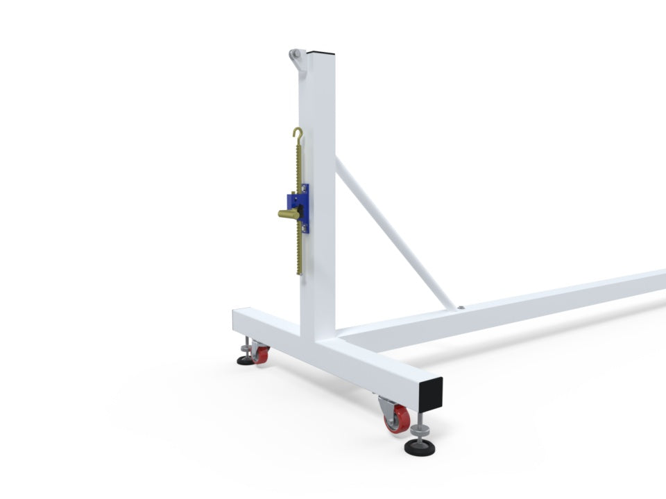 7 adjustable support legs that the structure rests on during play and not on the wheels. No need to disassemble the structure each time for storage. Integrated 104 kg counterweights in the post base. Six built-in wheels allow the pole to be moved in one piece.