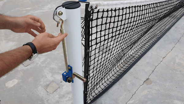 The net is tensioned using an external rack and pinion system, sold with a crank. These tennis posts can be easily installed and do not require sockets. Unlike most tennis poles on the market, these tennis poles do not need to be fixed to the ground, making them ideal for use inside a gymnasium, breakout room sports or a schoolyard.