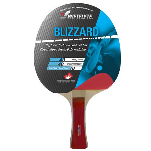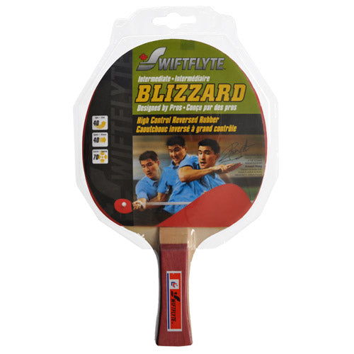 Swiftflyte Blizzard Ping Pong Paddle perfect for the intermediate player. Standard D-8 rubber, 1.5mm 2A sponge thickness, red ribbon outline, 40 speed, 40 spin, 70 control. Choice of concave, anatomic or ribbon shaped handle.