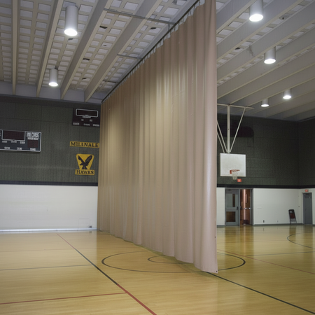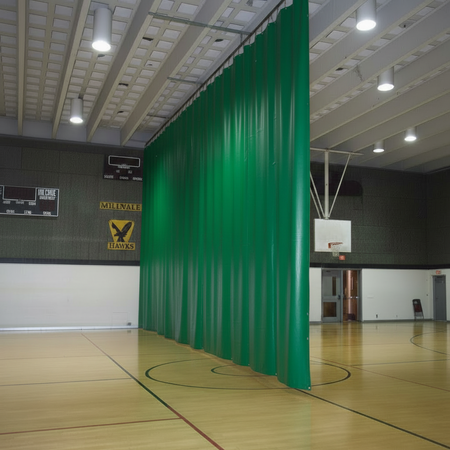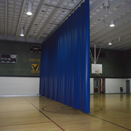 Gymnasium divider curtain made of vinyl and mesh combination or vinyl only.