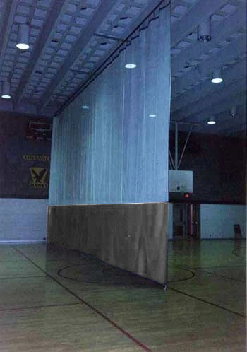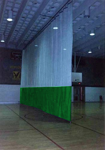 Gymnasium divider curtain made of vinyl and mesh combination or vinyl only.