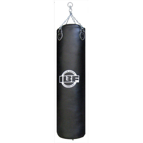 Heavyweight boxing training bag made of durable IBF PVC vinyl. Equipped with welded D-hook. Chain spray painted. Filled with a fiber blend. Choice of bag at 75 lbs and 100lbs