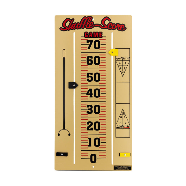 Shuffleboard scoreboard. A weather-resistant polyboard scoreboard with an aluminum face. Featuring plastic score indicators that slide up and down, it easily keeps score up to 75. Additional plus and minus indicators at the bottom allow players to track negative scores as well.