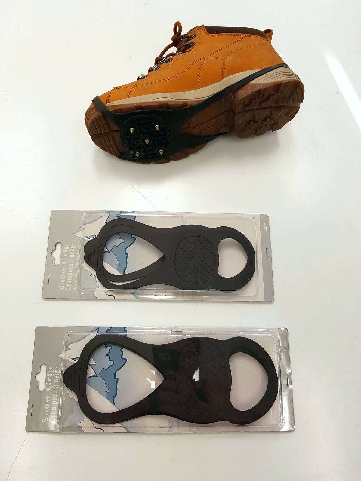Snow cleats attach easily under most types of boots and shoes. Medium or large standard size. Made of rubber and stainless steel cleats. Black color.
