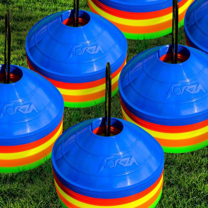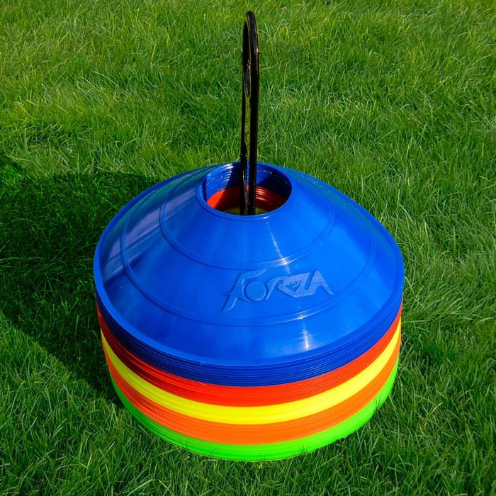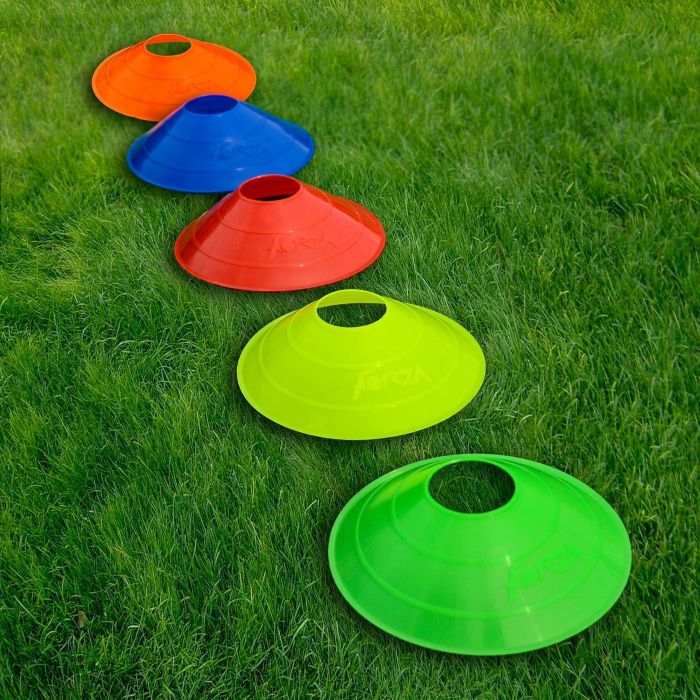 FORZA soccer training marking cones. Made from durable plastic, the cones measure 20.5 cm in width and 5 cm in height. They come with a plastic holder for easy storage and portability. Available in 10 fluorescent colors, these marking cones can greatly enhance efficiency and focus during soccer training sessions.