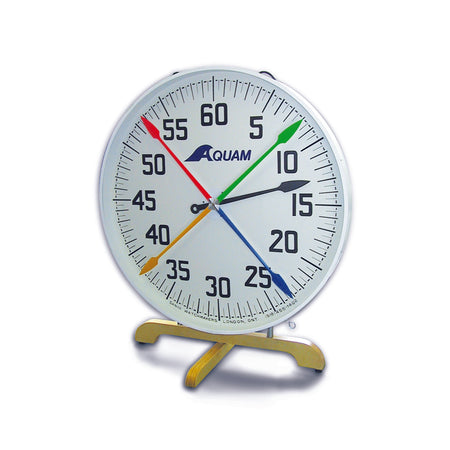 The Sanio pedestal pool clock is 36" in diameter, the numbers are readable from anywhere in the pool. The clock has a hand for the minutes and four hands of various colors for the seconds. A transparent acrylic surface covers the clock.