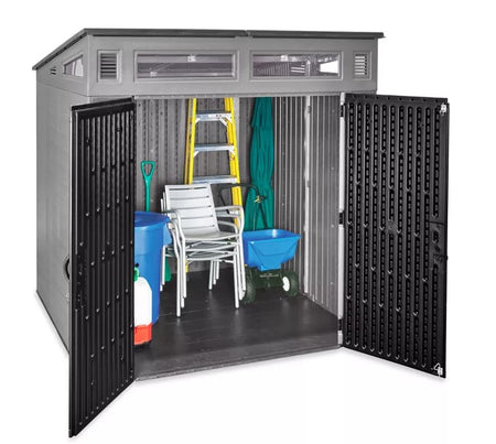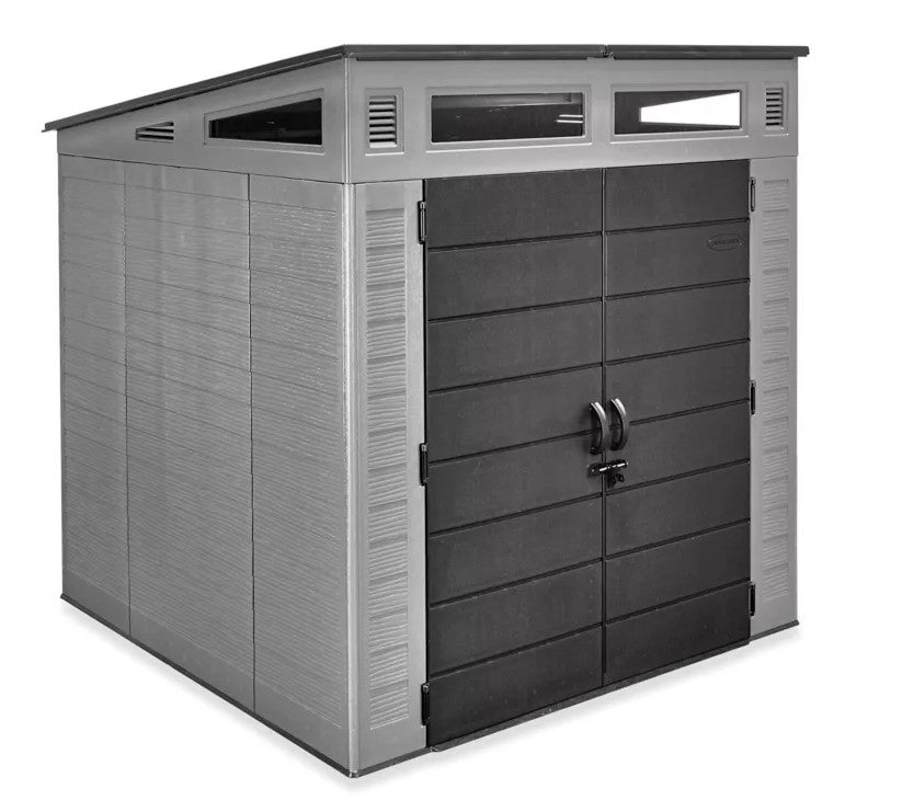 The Suncast Park Shed with window. Weather-resistant plastic that does not rust or rot. Durable steel frame ensuring the roof withstands snow and rain. Floor coating included. Panels snap together and can be assembled in less than 30 minutes. Double sturdy doors that can be locked.