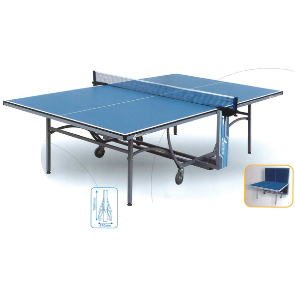 The Swiftflyte Magnus ping pong table is designed for heavy use at home, school, or clubs. It folds for solo practice or easy storage. Its wheels and sturdy frame offer durability and ease of movement. Includes a net and a set of easily attachable posts. Folds for solo play or easy storage. Features the DBS (Diagonal Bending Support) system for added strength and stability. Includes a robust net and post that are easy to attach. 18mm (0.7in) thick MDF top with sixteen layers of repeated roller coating for a firm and consistent bounce.