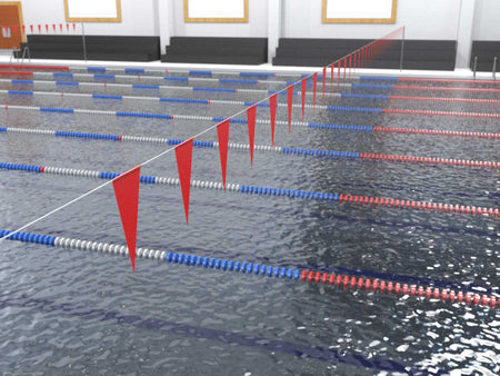 Swim lane flags. Backstroke competition flags strung across the pool 5 meters from each end to inform backstroke swimmers that the wall is 5 meters away. Posts + sockets included