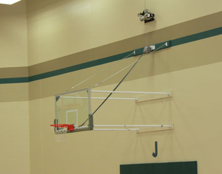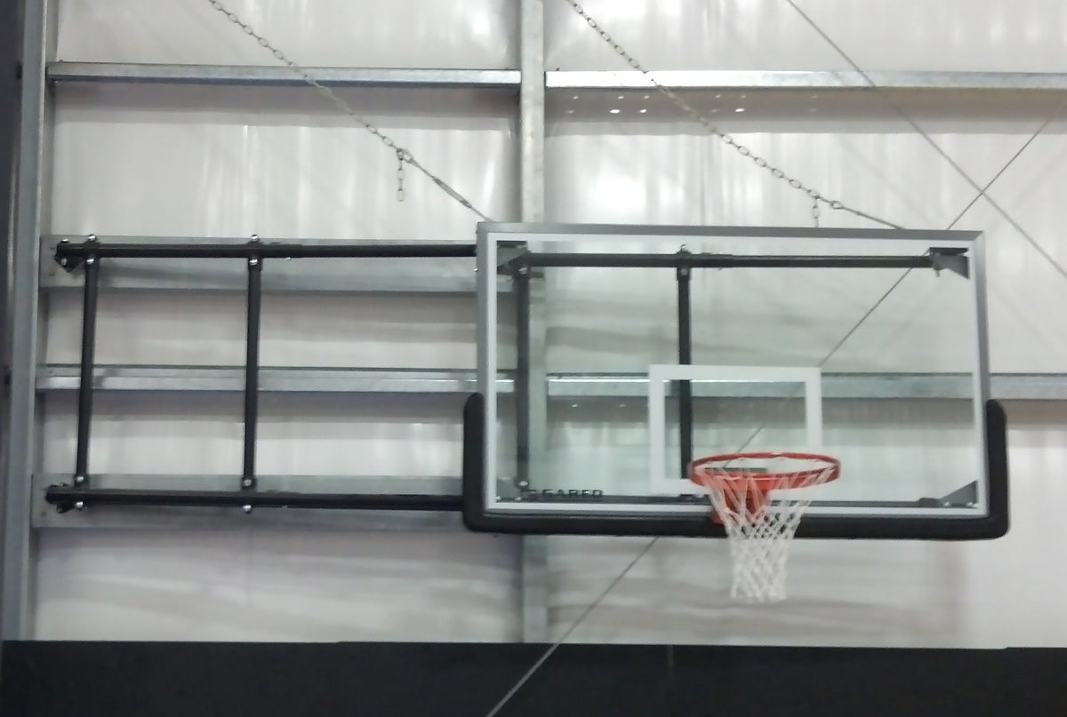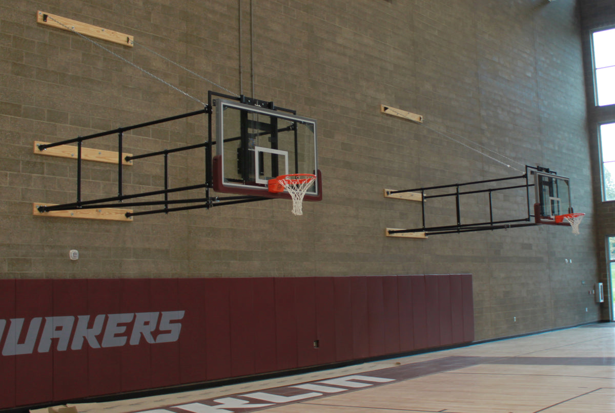 Wall-mounted basketball hoop system. The side-folding wall brackets are based on the traditional four-point mounting design and allow the unit to store in a horizontal folding position to make room for other field activities.