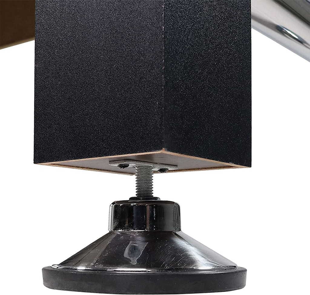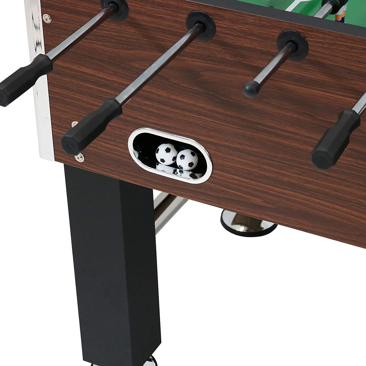Sunnydaze foosball table made of laminated MDF with chromed plastic corners. Size 55" long x 52" wide x 36" high. Weight of 52 kg. Recommended for the home but tough enough for commercial use. Adjustable legs. Includes 2 game balls, 4 leg levelers, players, manual scoring units, side ball returns and cup holders. Ball bearings allow the rods to spin easily while the molded handles make them easy to grip. In stock for fast delivery