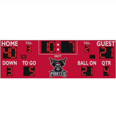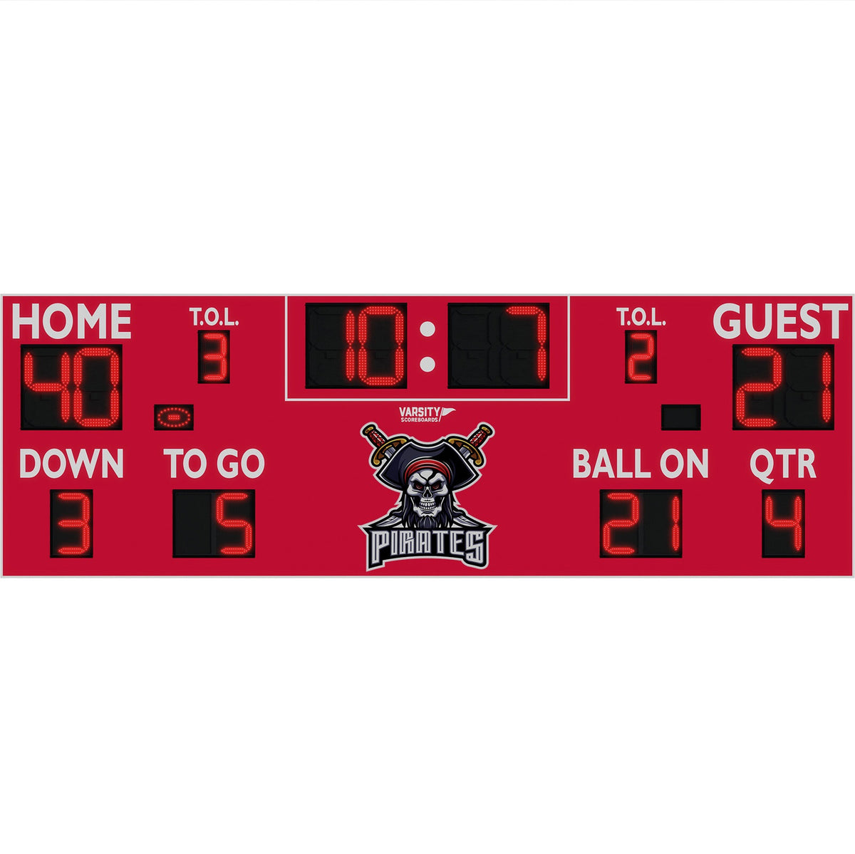 Outdoor football scoreboard with choice of colors. Dimensions of 24' x 8' x 8" thickness. Figures of 26" x 20" and 15" LED. Clock up to 99:59. Displays in digital 2 digits, the score of each team, the quarter, the attempt, the distance to be crossed and the situation of the ball. Contains an end-of-match siren. Possession indicator.