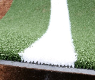 Artificial grass baseball batting mat with home plate and box line for right and left handed batter. Size of 6' x 12'. Choice of grass or clay color. The mat has a 5mm thick cushion. the mat is removable and can be transported easily from one field to another. Outdoor or indoor use possible. Resists spiked shoes.