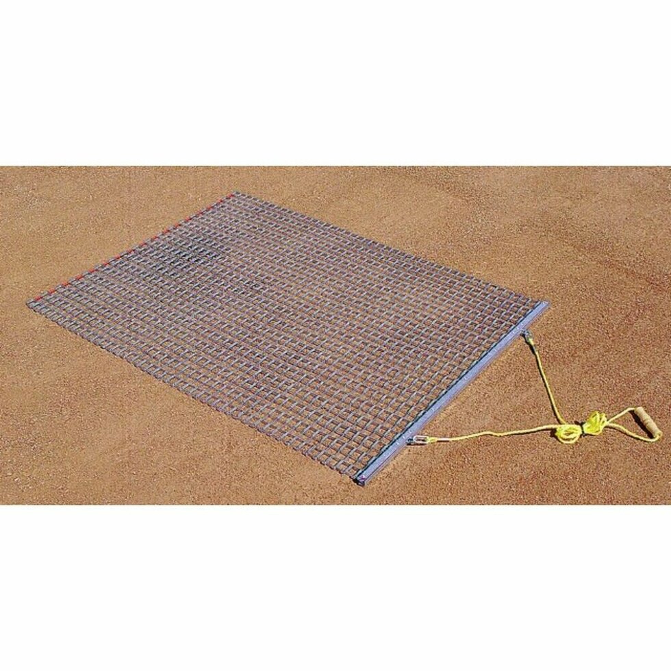 Steel leveling mat with handle and rope for leveling gravel to the ground, the perfect baseball maintenance tool.