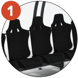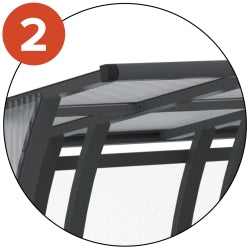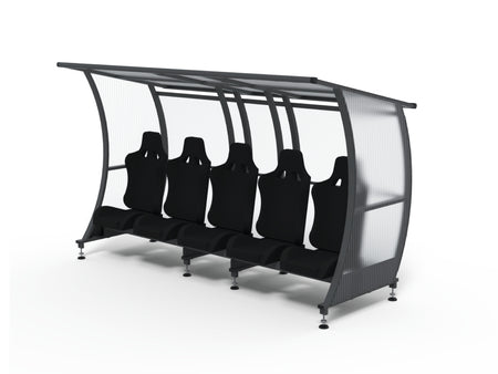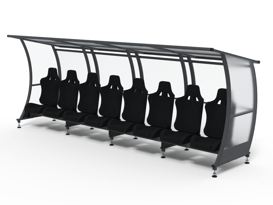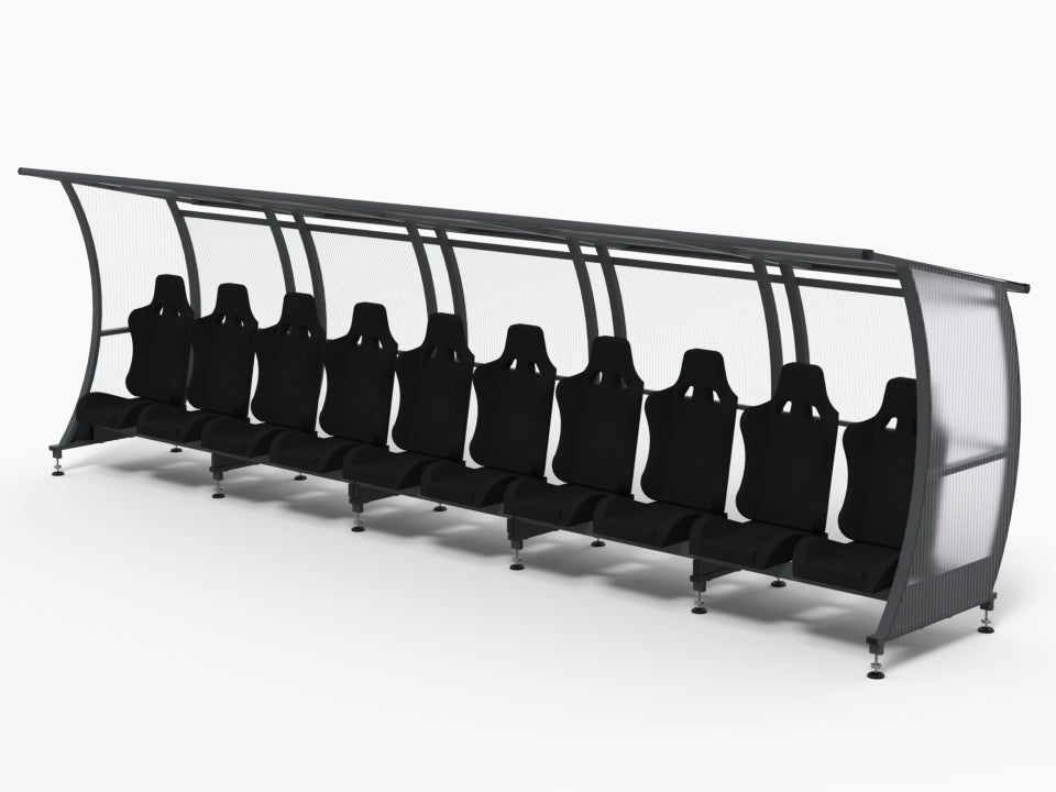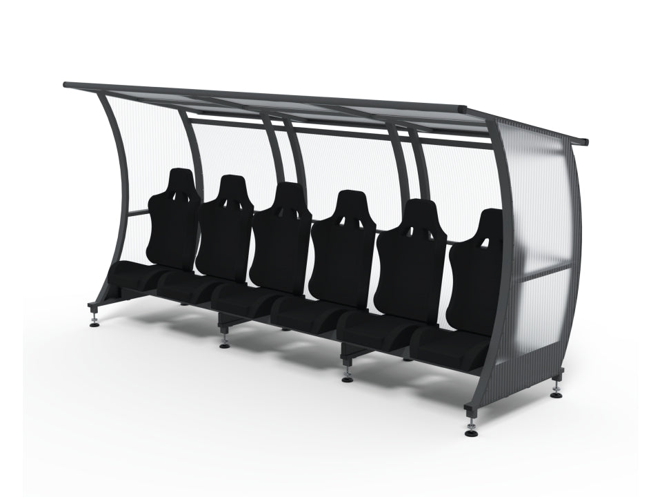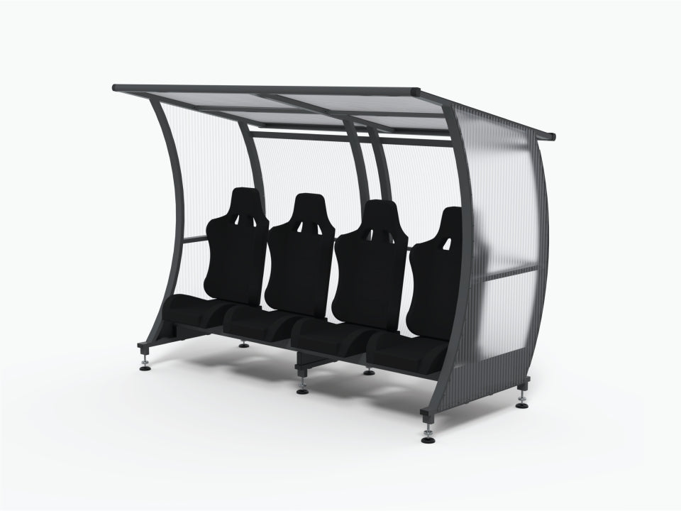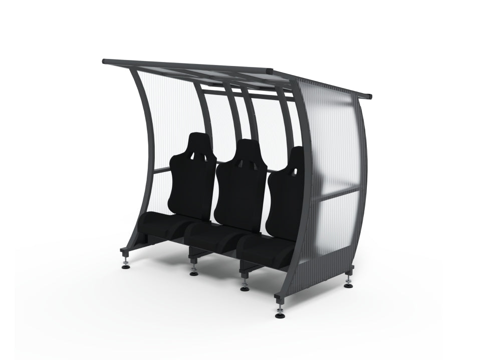 Team shelter with aluminum profile. Height of 2.0 m. Made of polycarbonate on the top, back and sides. Ergonomic VIP seats, top bar with curved profile to prevent head injuries and hide restraints.