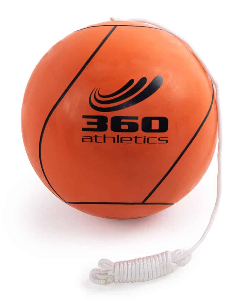Tetherball with rope. 8" D ball and 93" long durable nylon rope. Perfect for hanging on 10' high posts. Classic orange ball made of reinforced, latex-free rubber.