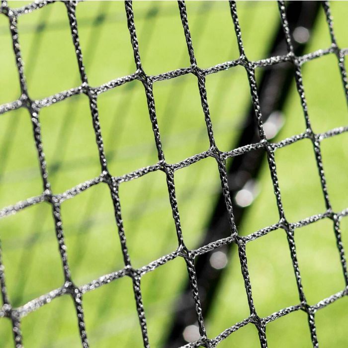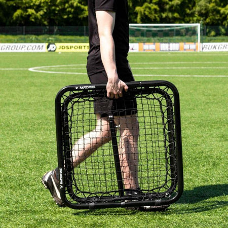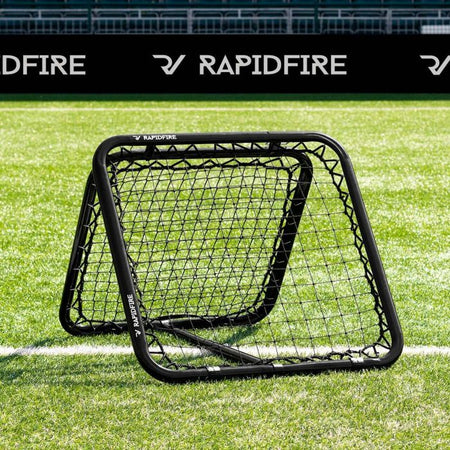 RapidFire RF80 Training Rebounder, 2.5 ft x 2.5 ft, made with two spring target zones. 1.5 mm weather-resistant steel frame. Folds flat for easy storage and transport. Double-sided knotted and knotless HDPE netting, 2mm finish.