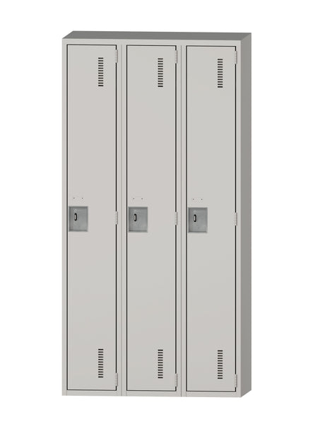 72" full height triple locker set. Total unit of 45" x 18" x 72". Choice of three colors. Includes 3 metal lockers with latch and 3 metal hooks with rounded ends per compartment, 2 on the sides and 1 at the bottom. . The handle is recessed and allows to receive a padlock. Each door is equipped with a magnet device to keep the door closed.