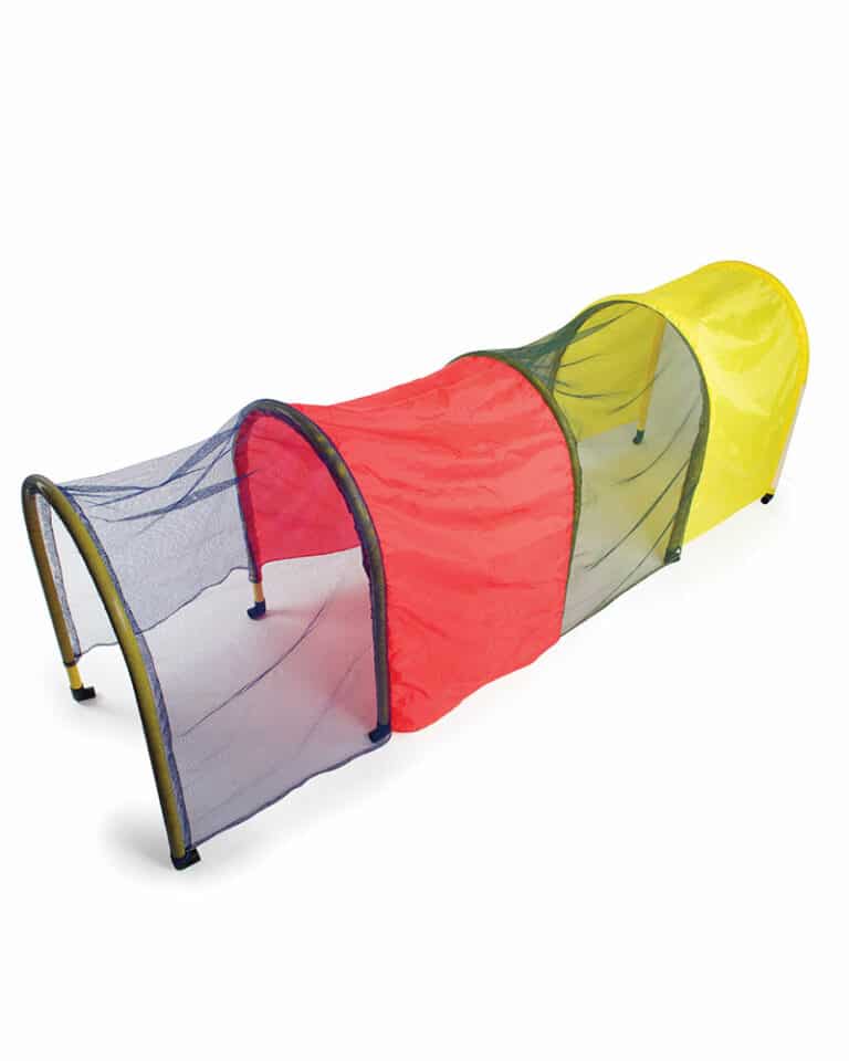 Super durable and strong! Each arch-shaped tunnel is made up of four panels in different colors, two solid colors, and two with mesh.