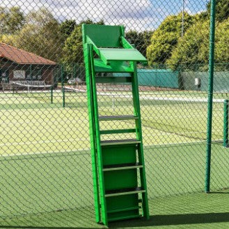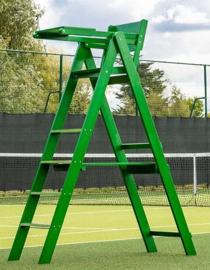 Vermont wooden tennis umpire chair. Handcrafted professional tennis umpire chair made from premium wood and painted green. The simple folding design allows for easy storage. Complete with a swivel tray, non-slip steps, and sturdy steel fittings.